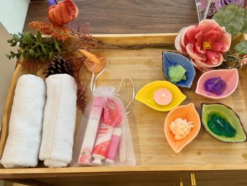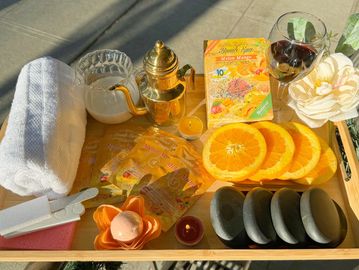 plus organic Bomb soak, rose flower soak, scented candle, exfoliating sugar scrub, cooling gel, moisture mask, hot towels, collagen lotion, hot stones, paraffin wax, nail polish, 12-min relaxing massage for feet, legs, shoulders.